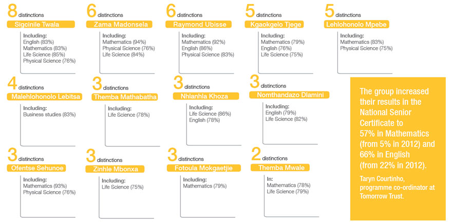 The ethos of Tomorrow Trust has always been medium to longterm investment in their beneficiaries’ academic studies, in order to lead them to economic empowerment and to become contributing members of society. The team at Tomorrow Trust achieves this by providing youth with academic support in schools via the Holiday and Saturday School programmes, as well as providing Grade 12 youth with academic support in post-secondary studies.